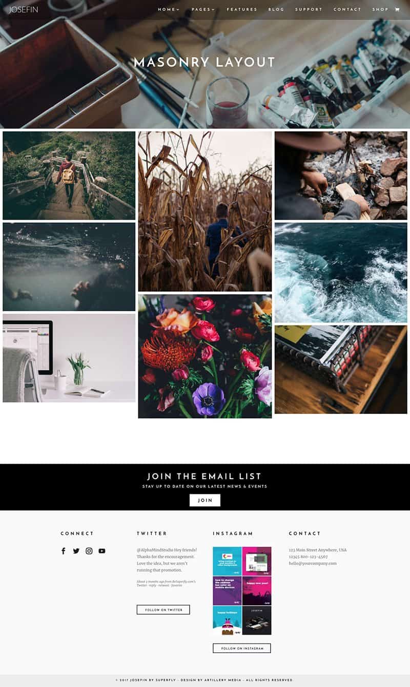 From the beginning, Josefin was designed to be clean, simple and modern. Attention to detail was paramount throughout the design and build process. Clean typography with generous amounts of white space ensure an enjoyable reading experience, while also allowing stunning photography to shine.